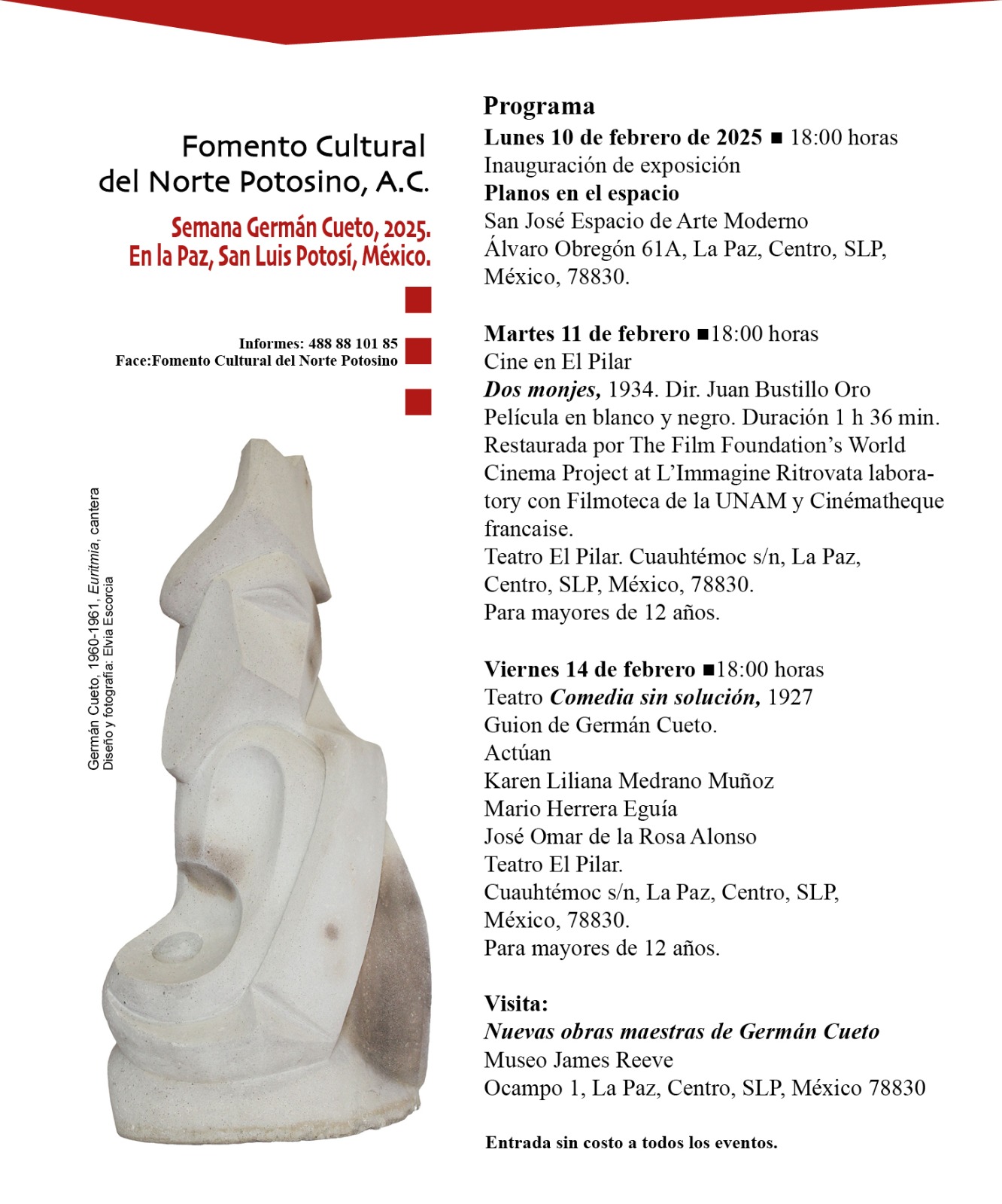Con motivo del 130 aniversario del Natalicio del gran escultor mexicano Germán Cueto, se presentó el 9 de febrero en el Teatro El Pilar de La Paz, San Luis Potosí, una serie de lecturas de poemas de Federico García Lorca y el cuadro Temple Flamenco.