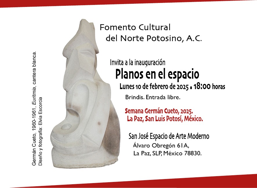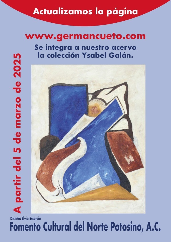 Fomento Cultural del Norte Potosino, A.C., es una organización mexicana de la sociedad civil sin fines de lucro que auspicia la página www.germancueto.com, que tiene como objetivo, sin obligación o responsabilidad alguna con el consultante, compartir digitalmente información histórica, artística y visual relativa al escultor mexicano Germán Cueto (1893-1975). No certifica ni avalúa obras de arte, datos u objetos culturales de cualquier tipo, autor, época, materia o nacionalidad. No se responsabiliza de la veracidad de las fuentes consultadas ni de los datos ofrecidos. No solicita, almacena o comparte información personal de quienes la consulten o contacten. Asimismo, nos reservamos el derecho de dar respuesta a solicitudes o consultas. Las imágenes pueden estar sujetas a derechos de autor de sus respectivos propietarios.